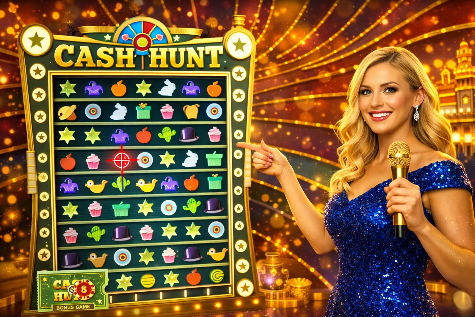When Cash Hunt begins, the usual wheel view steps aside and the bonus display takes over the screen. The presenter is still part of the moment, still reacting and guiding the flow, but visually the feature becomes the main thing you are watching.